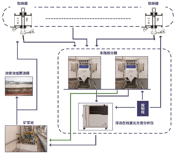 该技术装备基于世界杯(中国)一站式服务官网北矿检测依托承担的“十三五”国家重点研发计划“重大科学仪器设备开发”专项项目,主要针对选矿工艺过程中原矿、精矿、尾矿等过程矿浆产物中元素分析检测滞后,选矿工艺关键参数无法实现实时动态智能化调整的技术瓶颈,研发了融合全自动刀口取样、全自动多路缩分、激光光谱分析、智能控制等技术,适用于选矿工艺过程矿浆中主要元素组分的在线激光诱导击穿光谱分析检测。实现了对选矿工艺过程原矿、精矿、尾矿矿浆元素品位的实时在线分析,为选矿工艺智能控制提供实时、快速、准确的分析结果,填补了激光诱导击穿光谱技术在选矿工艺的应用空白,解决了非金属磷矿、锂、钾矿等轻元素矿产选矿工艺过程长期无法实现原、精、尾矿浆在线分析检测的世界性难题,使浮选工艺中矿浆成分单次测量时间从离线最少120 min降低到在线的5 min以内。可明显提高选矿厂生产的智能化程度,大幅度减少人工操作,增强生产流程稳定性,提高生产效率,降低生产成本,为企业带来可观的经济效益。