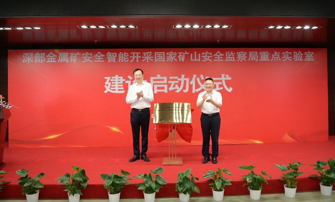 8月1日,深部金属矿安全智能开采国家矿山安全监察局重点实验室建设启动仪式在矿冶集团举行。国家矿山安全监察局政策法规和科技装备司司长薛剑光,集团党委书记、董事长韩龙,党委副书记、总经理周洲,副总经理马彦卿,云南驰宏锌锗股份有限公司党委书记、董事长陈青,长沙矿山研究院有限责任公司副总经理褚洪涛,中南大学资源与安全工程学院院长周子龙,中南大学教授王李管等相关领导出席。周洲主持启动仪式,薛剑光和韩龙共同为重点实验室揭牌。